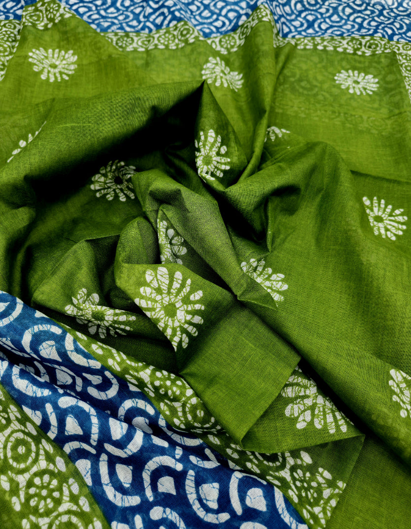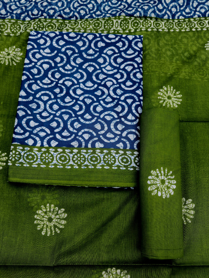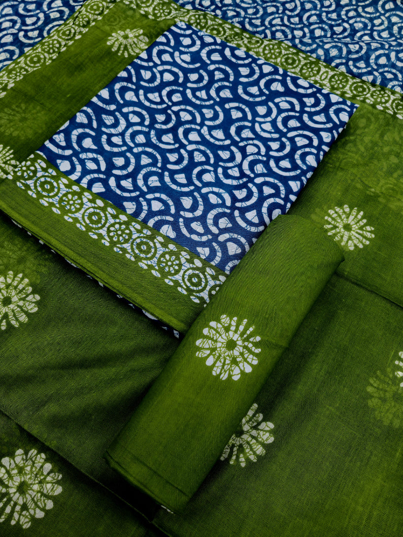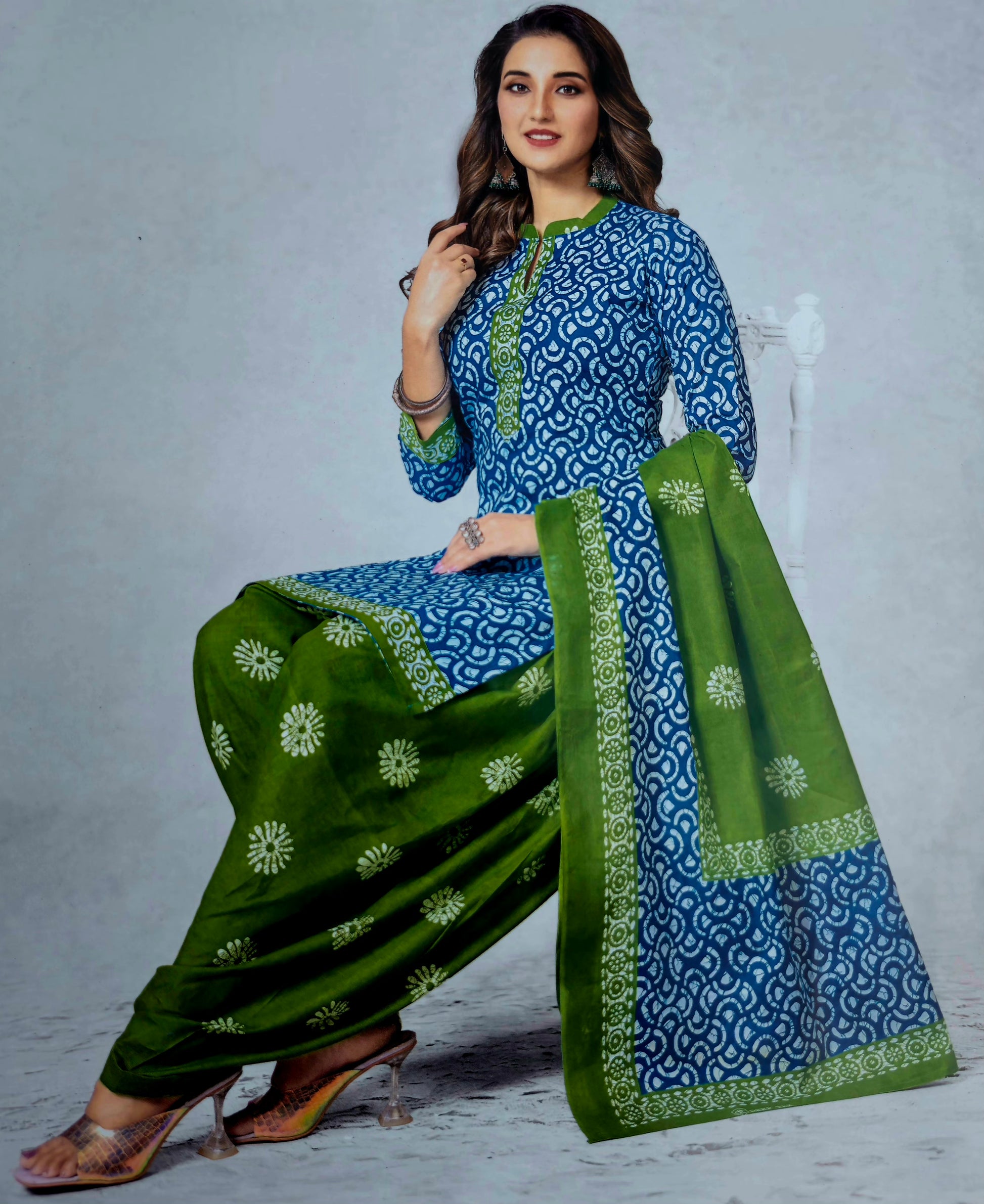 Add a splash of freshness to your ethnic wardrobe with this Blue & Green Printed Patiala Suit Set. Combining classic block print elements with modern hues, this unstitched outfit is perfect for both daily wear and casual occasions.