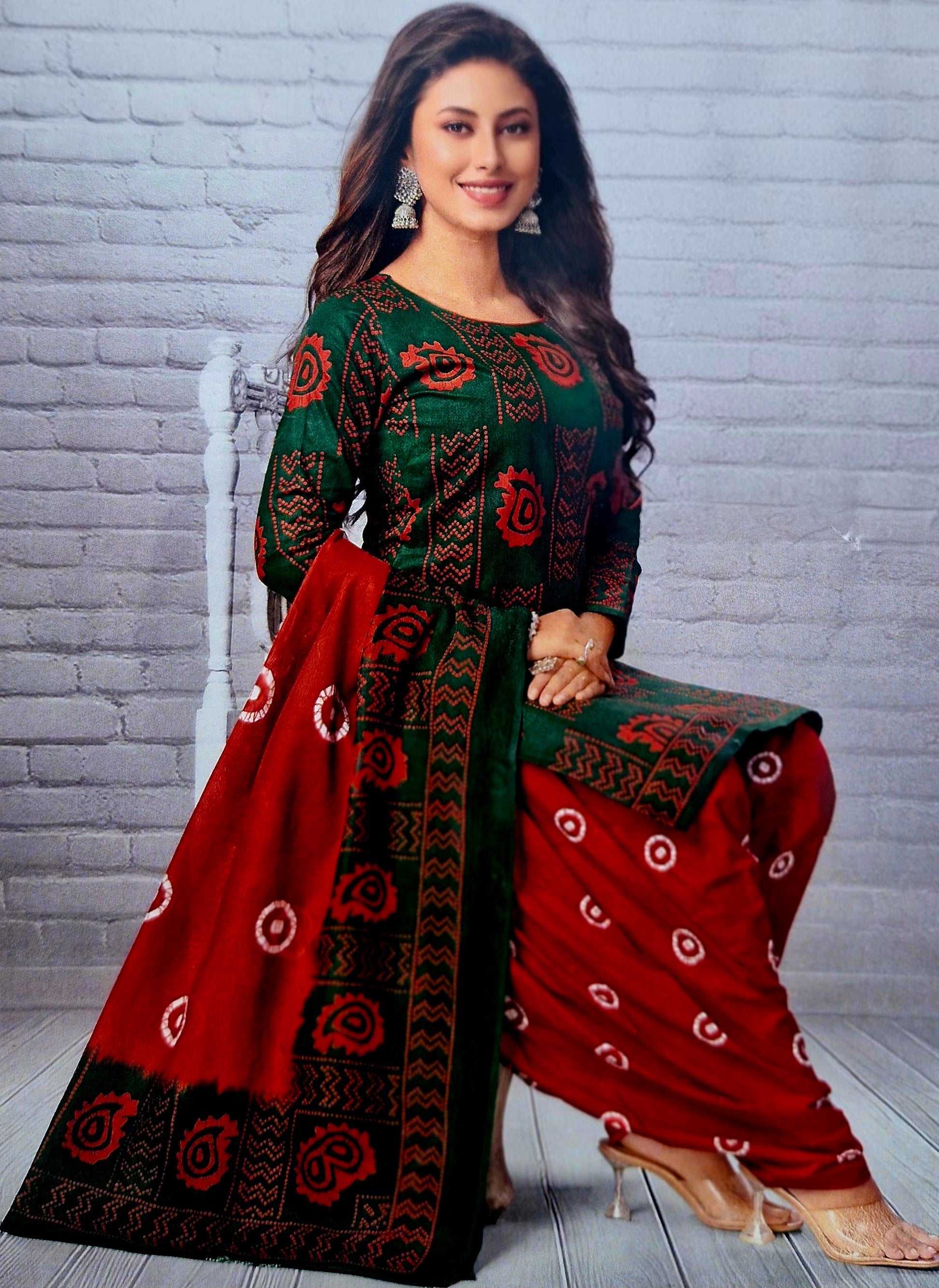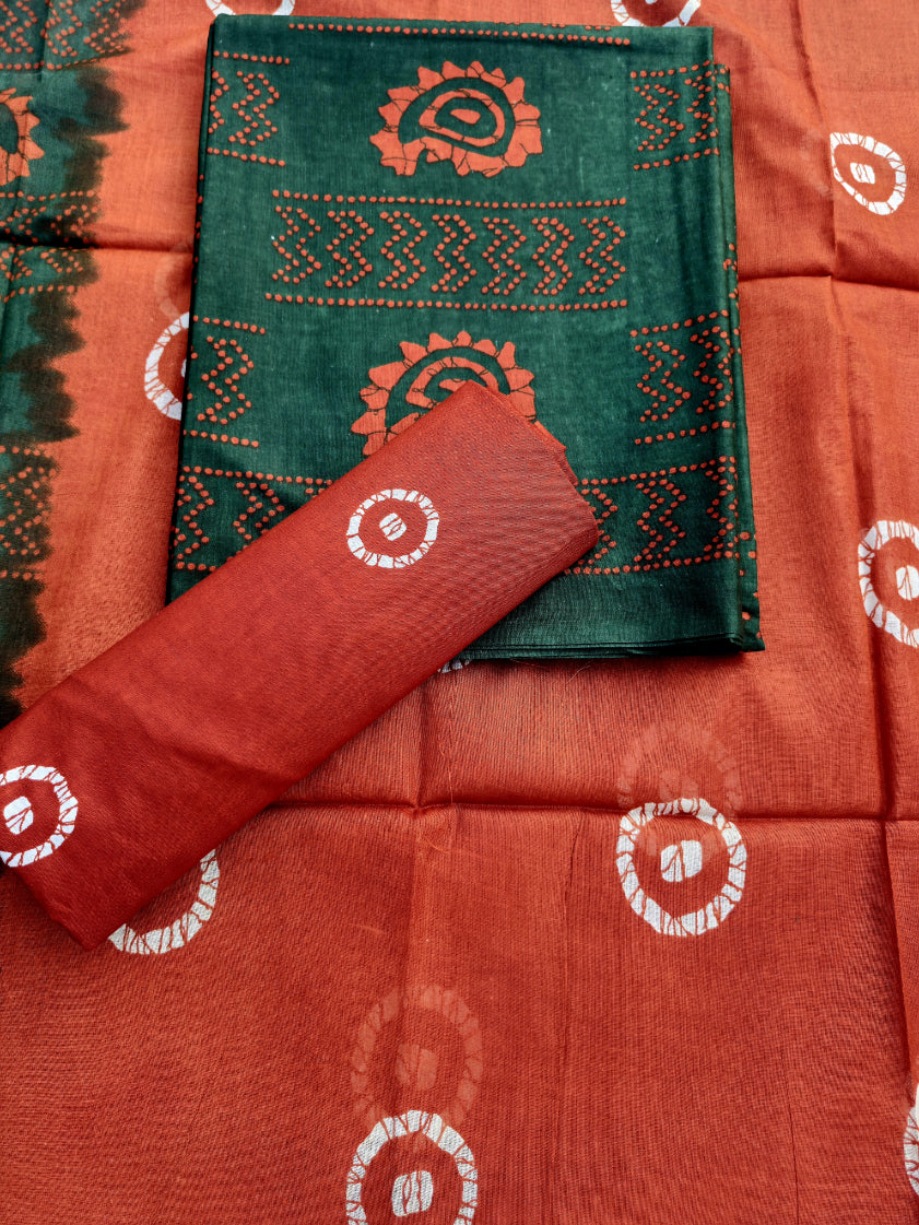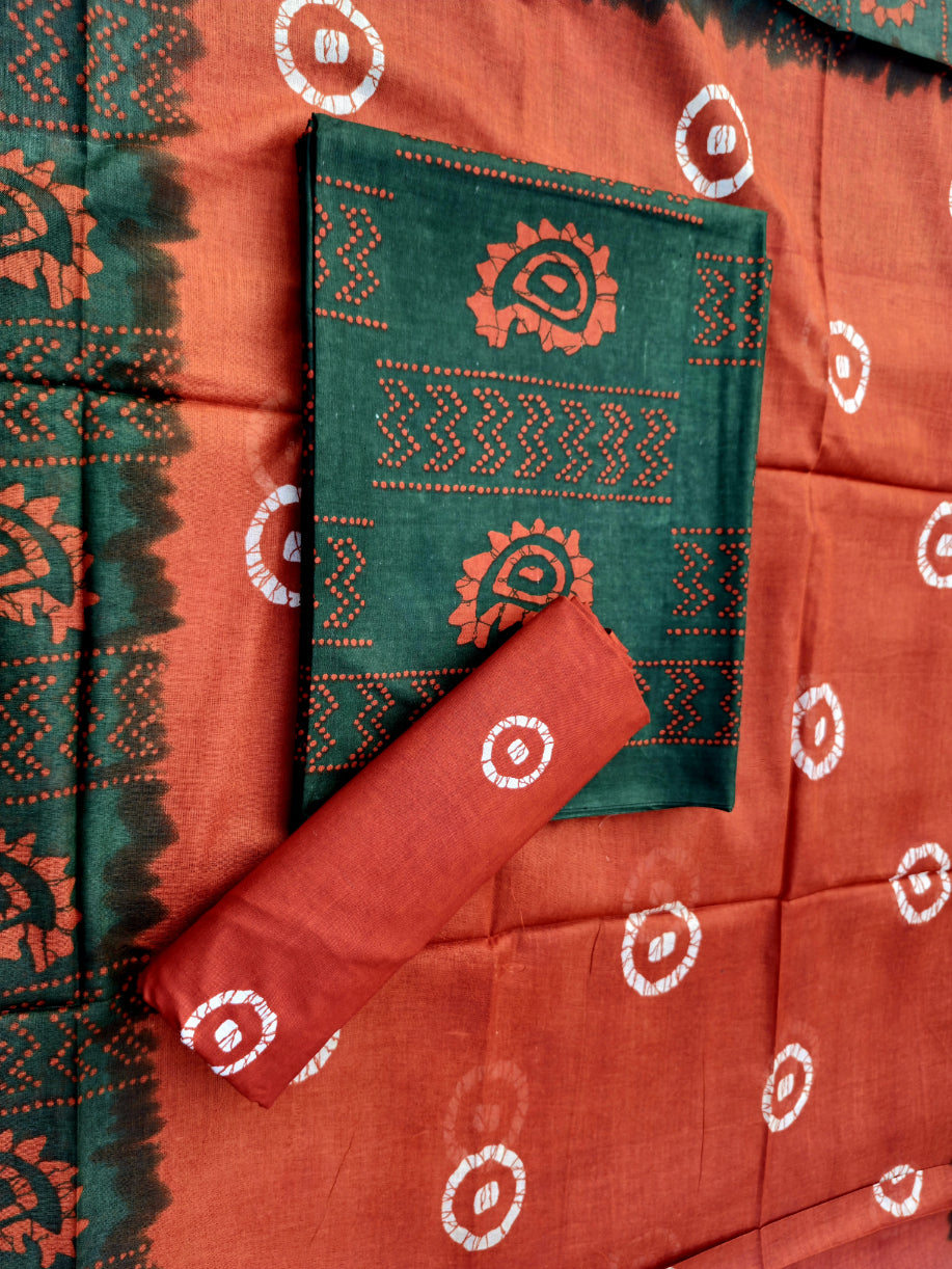 Bandhani Cotton Unstitched Suit Set – Green & deep orange