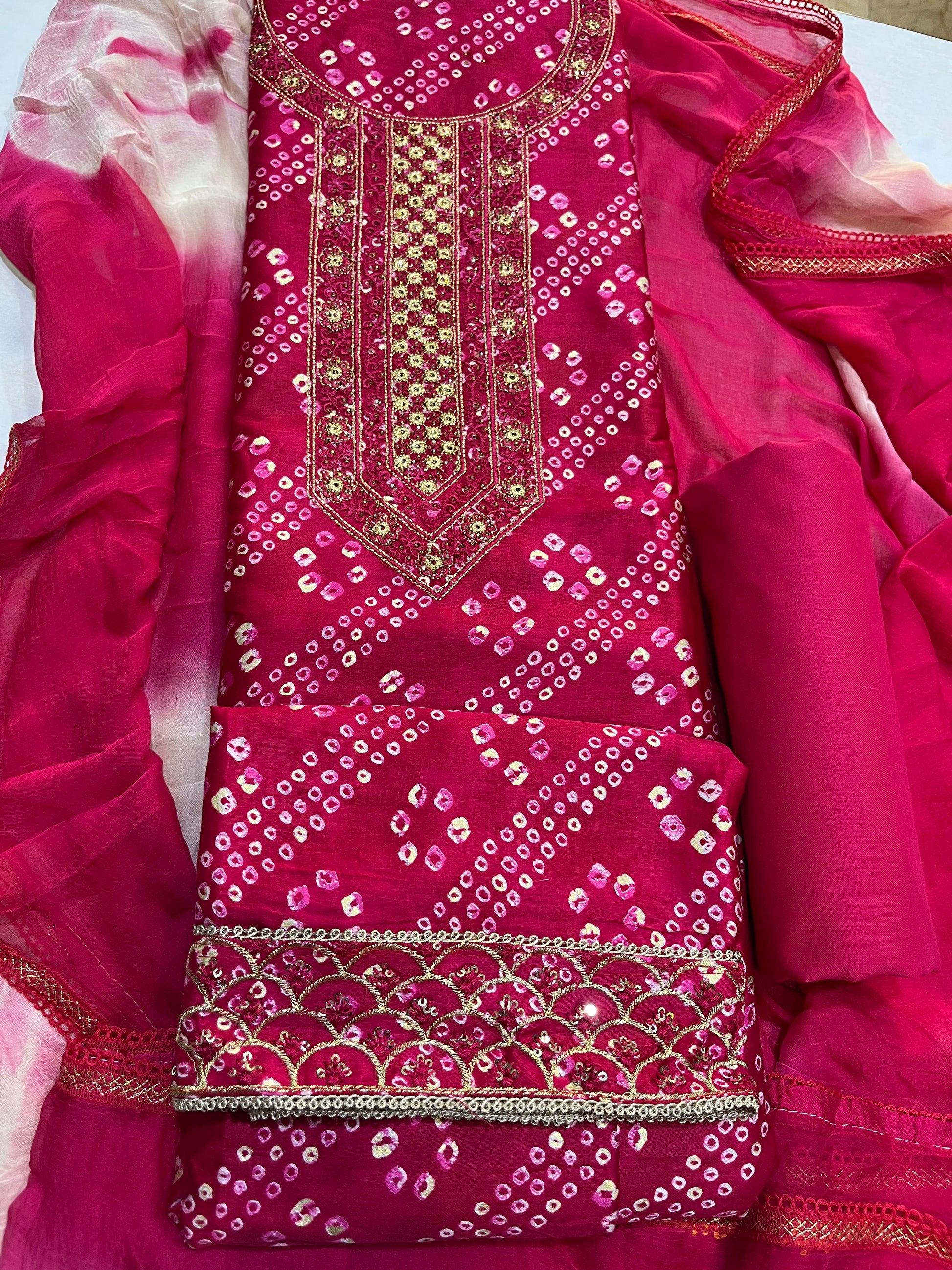 Step into timeless elegance with our Rani Pink Bandhani Suit Set, an exquisite blend of traditional craftsmanship and modern grace. The kurta showcases intricate swarovski crystal work and hand embroidery on a classic Bandhani-printed base, creating a regal aesthetic ideal for festive and cultural occasions. Paired with a beautifully dyed chiffon dupatta and plain matching bottom fabric, this set is a perfect statement piece for your ethnic wardrobe.